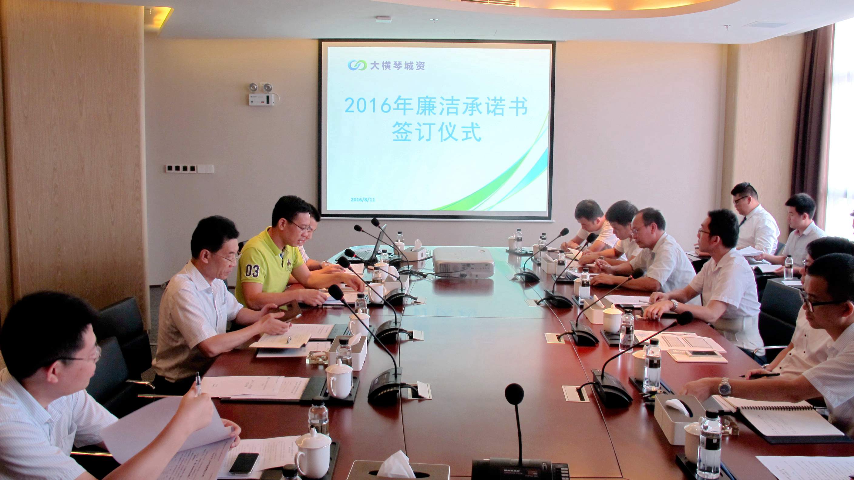 簽訂儀式上,綜合管理部、招標采購部、財務部等職能部門,以及各物業服務中心、市政管養中心等業務中心負責人現場與公司法人代表田總簽訂了《珠海大橫琴城市公共資源經營管理有限公司2016年廉潔承諾書》。