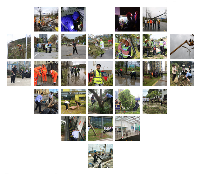 在搶險救災(zāi)過程中,公司市政部門集全體人員、盡一切力量快速清除路障,扶正種植倒伏樹木,第一時間恢復了橫琴主干道的通暢。物業(yè)各項目全員加班加點,奮力搶險救災(zāi)清障,同時確保業(yè)主單位和個人的財產(chǎn)人生安全。管廊公司迅速派出應(yīng)急搶修隊伍,投入橫琴“城市生命線”地下綜合管廊救災(zāi)復產(chǎn)工作。廣告部第一時間對廣告設(shè)施進行排查,設(shè)置警戒線,加快危險源清理,并及時拆除臨靠建筑物、人流量大的破損立柱廣告牌。酒店管理部迅速安頓住店客人,保護客人安全。工程技術(shù)部作為三防工作主要負責部門,時刻關(guān)注三防消息,及時準確通報臺風、安全等重要信息。綜合管理部、招標采購部等后勤保障部門人員也加班加點采購、運送物資。