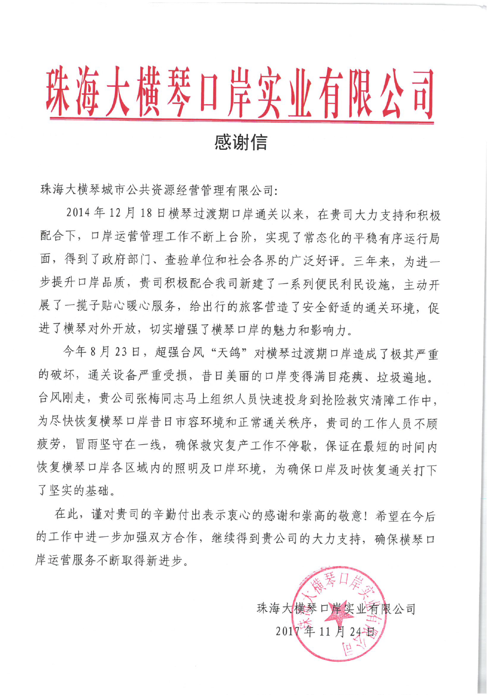 我司收到珠海大橫琴口岸實業(yè)公司的感謝信。