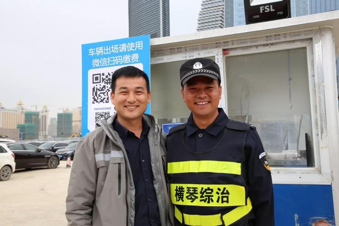采訪的最后,劉進熱情地招呼口岸客服主管陳磊和保安隊長丁旭東一同合影。劉進說,每年除夕到團年飯的時候,珠海大橫琴城市公共資源經營管理有限公司都會送來盤菜慰勞員工,但由于大家堅守崗位,這么多年連一次合影的機會都沒有。這一回面對鏡頭,三人相互挽著手臂,如愿記錄下了難能可貴的一刻。