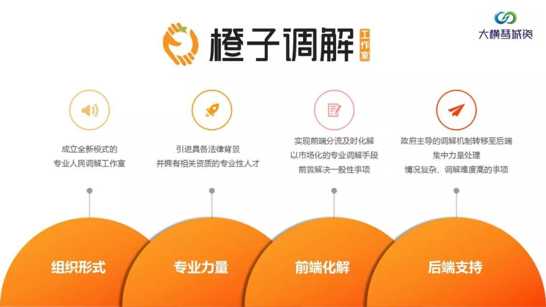 全新模式下,由新成立的橙子調解工作室作為專業(yè)機構前期介入各類調解,引進具備法律背景并擁有相關資質的專業(yè)性人才,充當好政府線上線下的“客服”角色。同時實現(xiàn)前端分流及時化解,以市場化的專業(yè)調解手段前置解決一般性事項,可調解服務的事項包括但不僅限于勞資糾紛、鄰里糾紛、涉港澳人士糾紛、醫(yī)患糾紛、婦女關愛調解、家庭矛盾疏導、心理咨詢服務等;同時,原政府主導的調解機制轉移至后端,集中力量專門處理情況復雜、訴求難以解決的調解事項。