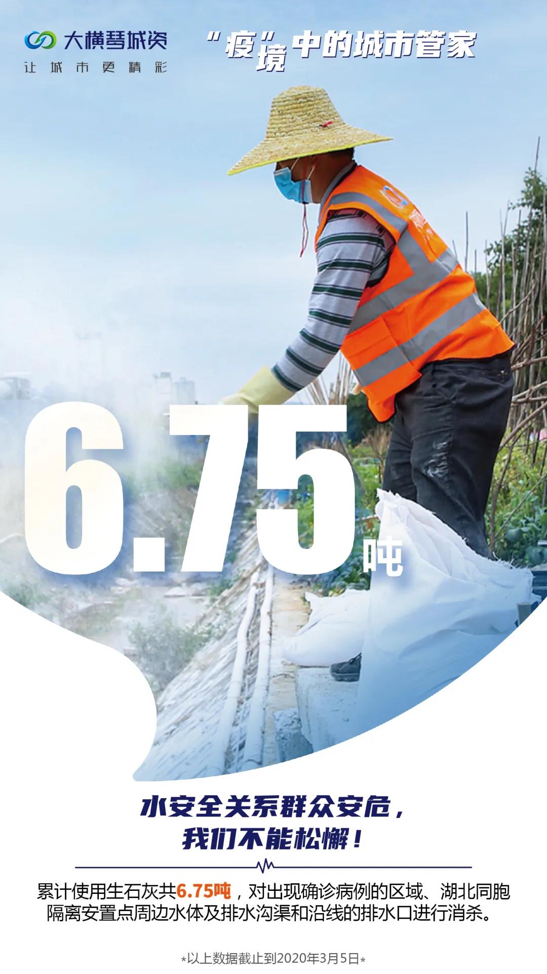 當專家指出新冠肺炎存在糞口傳播的可能后,大橫琴城資立即采用生石灰對出現確診病例的區域、湖北同胞隔離安置點周邊水體的排水口進行集中消殺,截止3月5日累計消殺排洪渠等相關區域59處,井口75個,累計使用生石灰297包共6.75 噸。