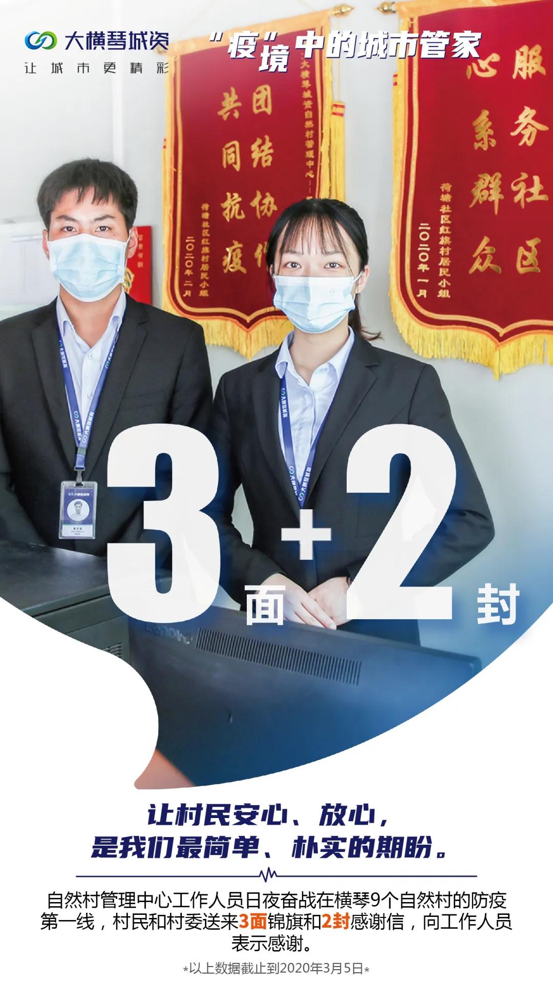 為支援前線工作,滿足疫情防控需要,在橫琴新區管委會的召喚下,大橫琴城資以多種形式選派優秀員工支援新區,如選送2名志愿者加入橫琴新區防疫工作組;選送5名退伍軍人加入橫琴新區民兵隊,協防橫琴新區管委會所在地橫琴鎮紅旗村;選送10名黨員參加橫琴新區防控新型冠狀病毒感染行動等。