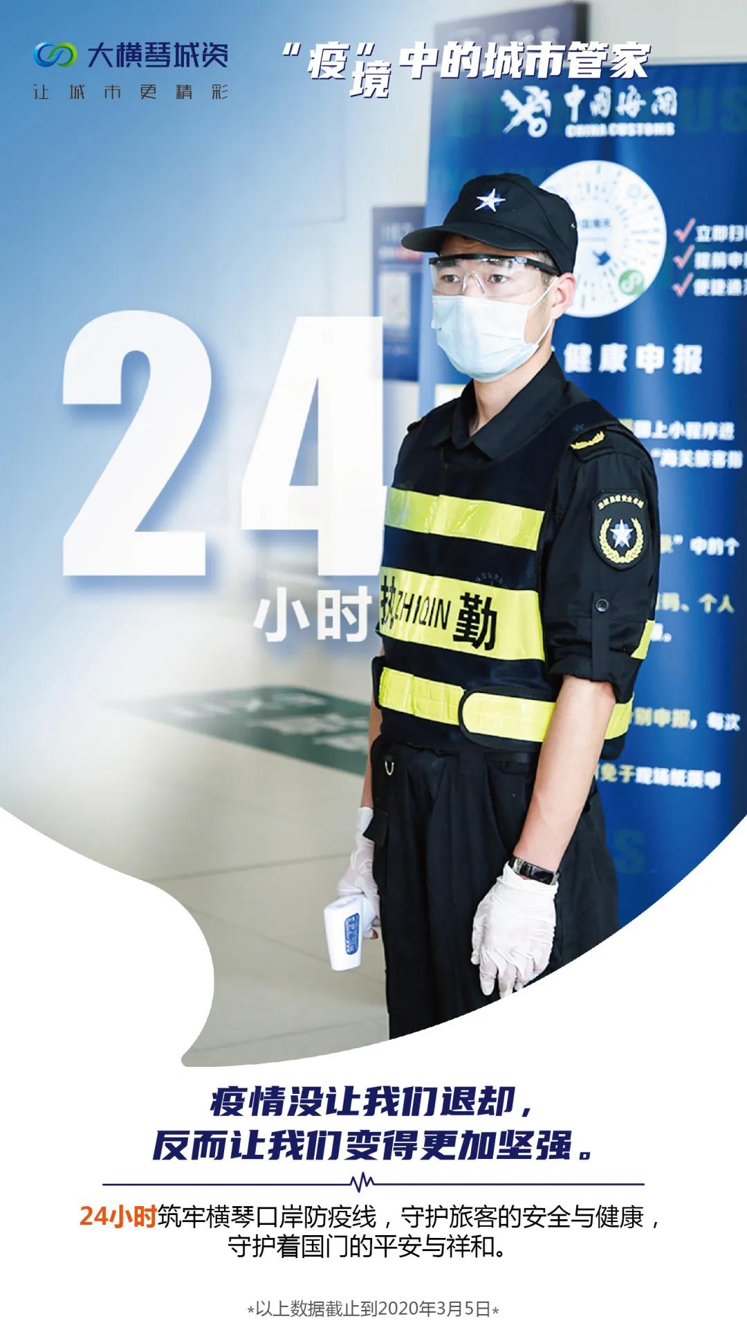 大橫琴城資主動承擔起橫琴口岸通關人員體溫檢測、信息登記等可能接觸新冠病毒攜帶者的高危工作,1月27日澳門特別行政區遣返湖北籍同胞后,大橫琴城資安排員工協助澳門方面和口岸檢疫部門隨車護送被遣返的湖北籍同胞到集中隔離醫學觀察點;此外,大橫琴城資配合橫琴政府排查自然村外來人員中的湖北籍人員,并為隔離觀察者提供測體溫和其它服務。