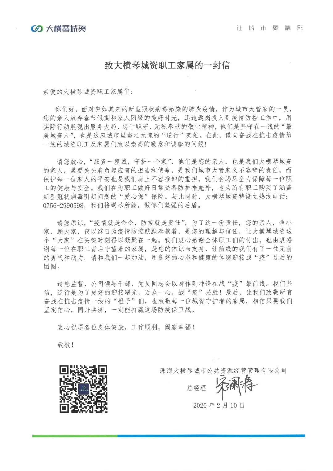 2月10日由總經理親自撰寫《致大橫琴城資職工家屬的一封信》發表在公司微信公眾號上,感謝家屬對大橫琴城資員工奮勇抗擊疫情的支持,并承諾公司全力保障員工的健康安全,一同打贏防疫阻擊戰。