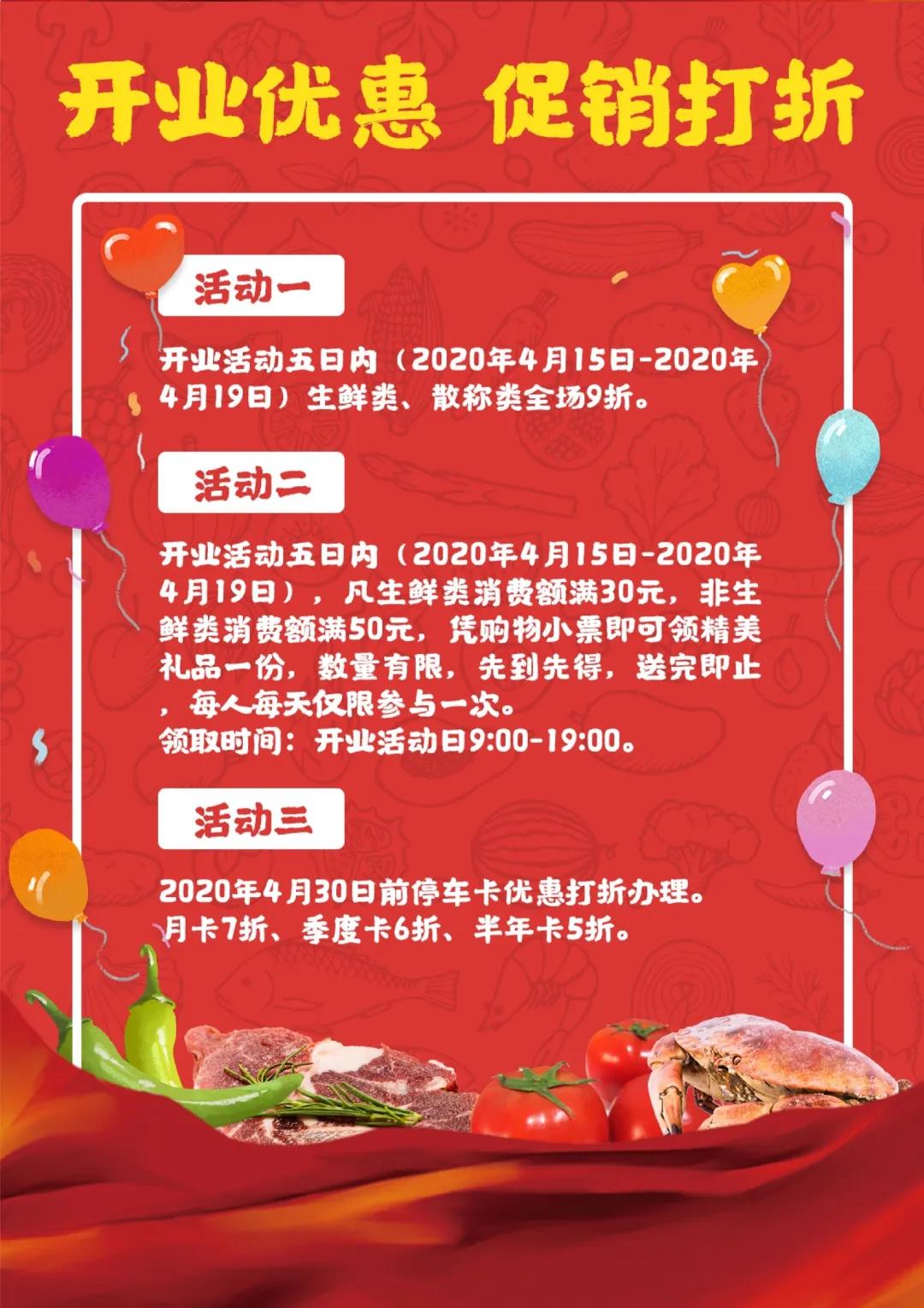 開業活動五日內(2020年4月15日-2020年4月19日),凡生鮮類消費額滿30元,非生鮮類消費額滿50元,憑購物小票即可領精美禮品一份,數量有限,先到先得,送完即止,每人每天僅限參與一次。