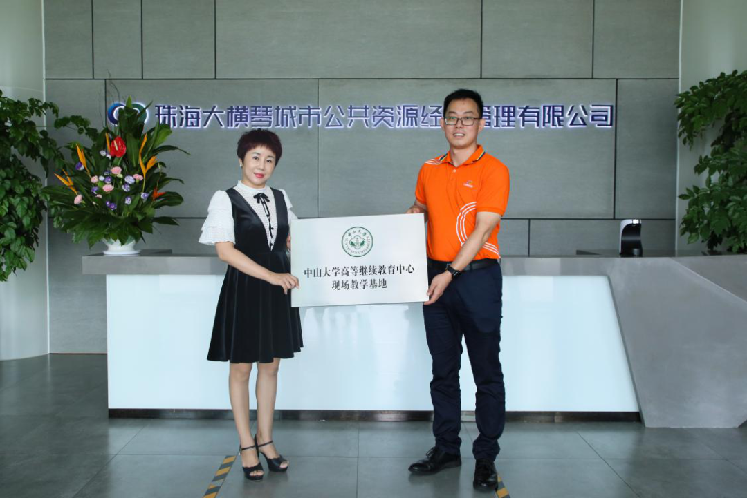 9月14日上午,中山大學高等繼續教育中心現場教學基地授牌儀式在大橫琴城資舉行。中山大學高等繼續教育中心公共管理培訓中心副主任、廣州中大紫荊教育有限公司總經理助理胡清秀與大橫琴城資總經理李志強共同為現場教學基地掛牌。