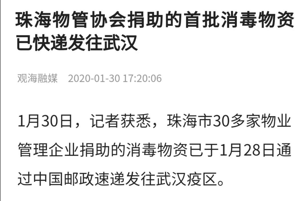 在年初國內疫情最嚴峻的時刻,珠海市物業管理行業協會發動支援疫區愛心捐款捐物活動,倡議各企業為武漢疫區捐款及捐助口罩、消毒水等防護物資。大橫琴城資積極響應,捐助了5000元,用綿薄之力為疫區民眾送去愛心與關懷。