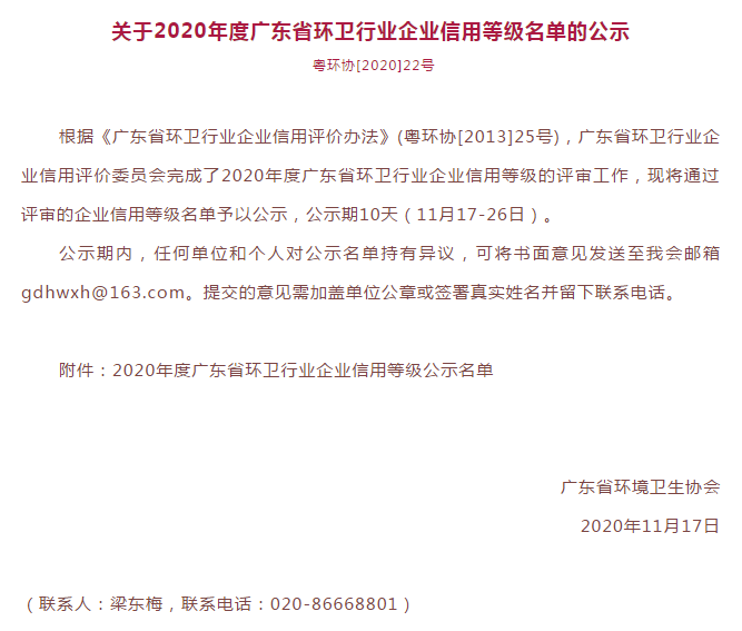 據了解,本著為環衛行業服務的原則,促進行業自律,營造環衛行業誠信經營的良好環境,廣東省環境衛生協會按照《廣東省環衛行業企業信用評價辦法》,啟動了2020年度廣東省環衛行業企業信用等級評價申報工作。