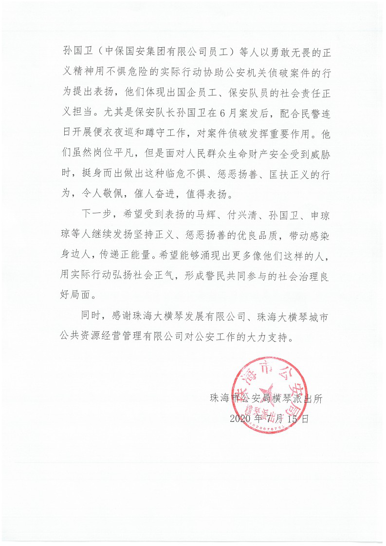 珠海市公安局橫琴派出所對馬輝、申瓊瓊、付興清、孫國衛(wèi)等人勇敢無畏地協(xié)助公安機關(guān)偵破案件的行為提出表揚。