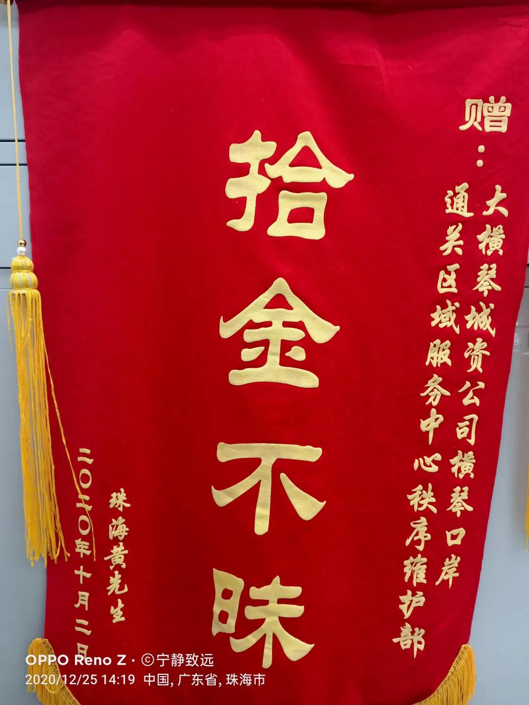 2020年12月,橫琴海關(guān)就優(yōu)質(zhì)的物業(yè)服務質(zhì)量贈與二線通道管理中心印有“精誠服務,情系海關(guān)”的錦旗一面及感謝信一封,以示感謝。