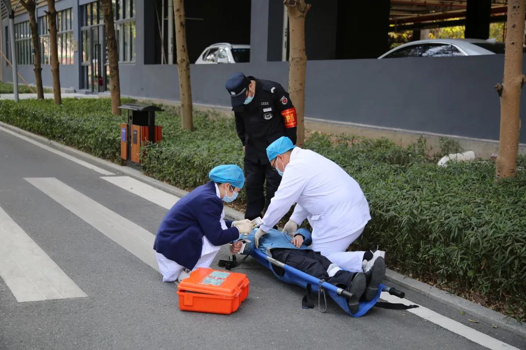 搶救組成員將“受傷人員”抬到安全地點(diǎn)做應(yīng)急包扎,救護(hù)車抵達(dá)現(xiàn)場,急救中心人員對沒有呼吸的“傷員”進(jìn)行心肺復(fù)蘇。