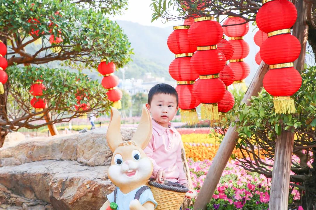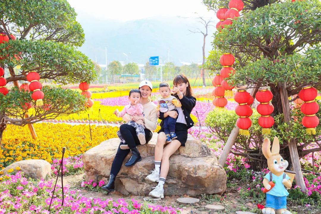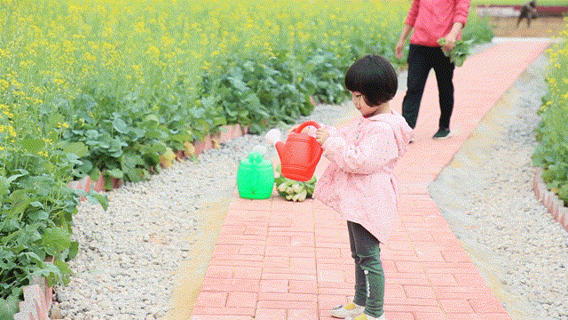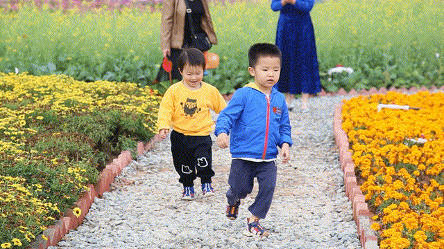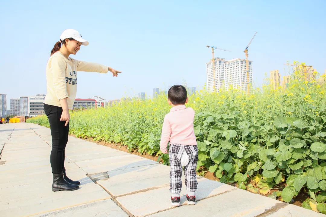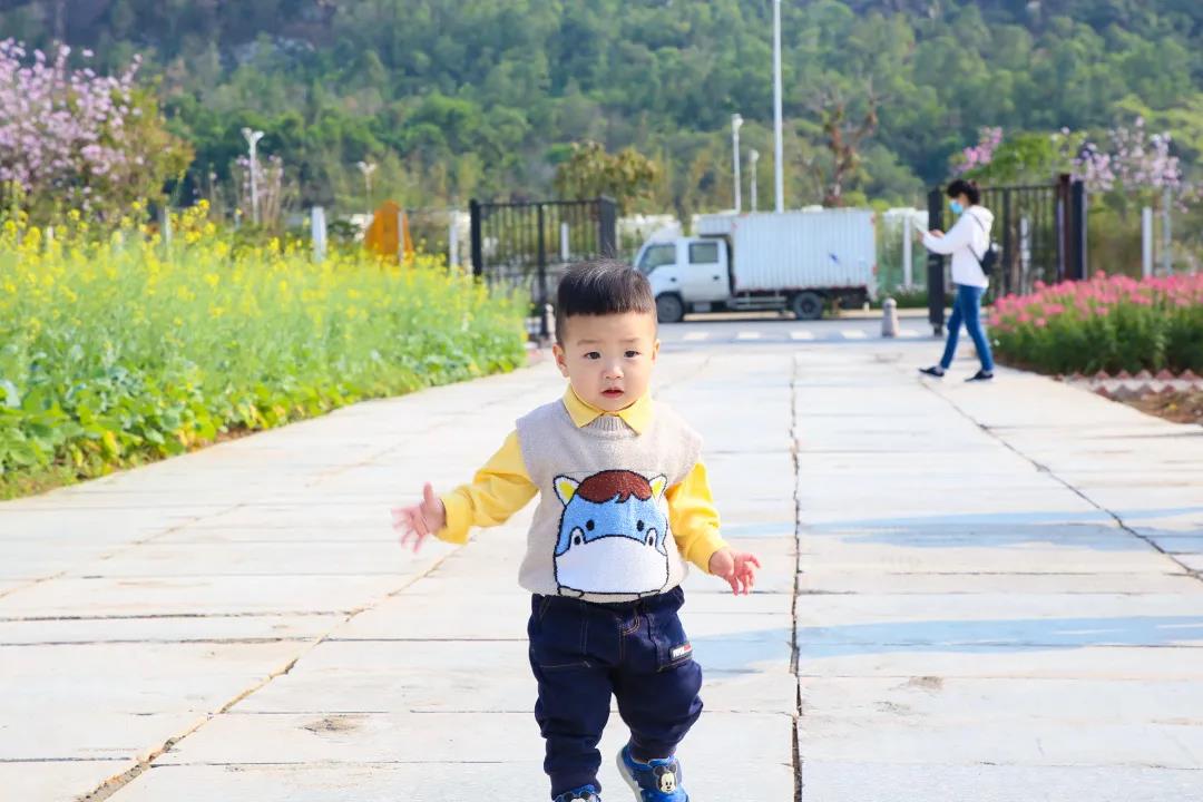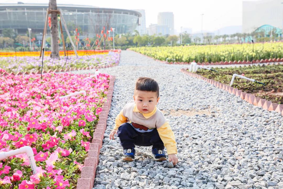 和孩子一起穿梭在花叢中