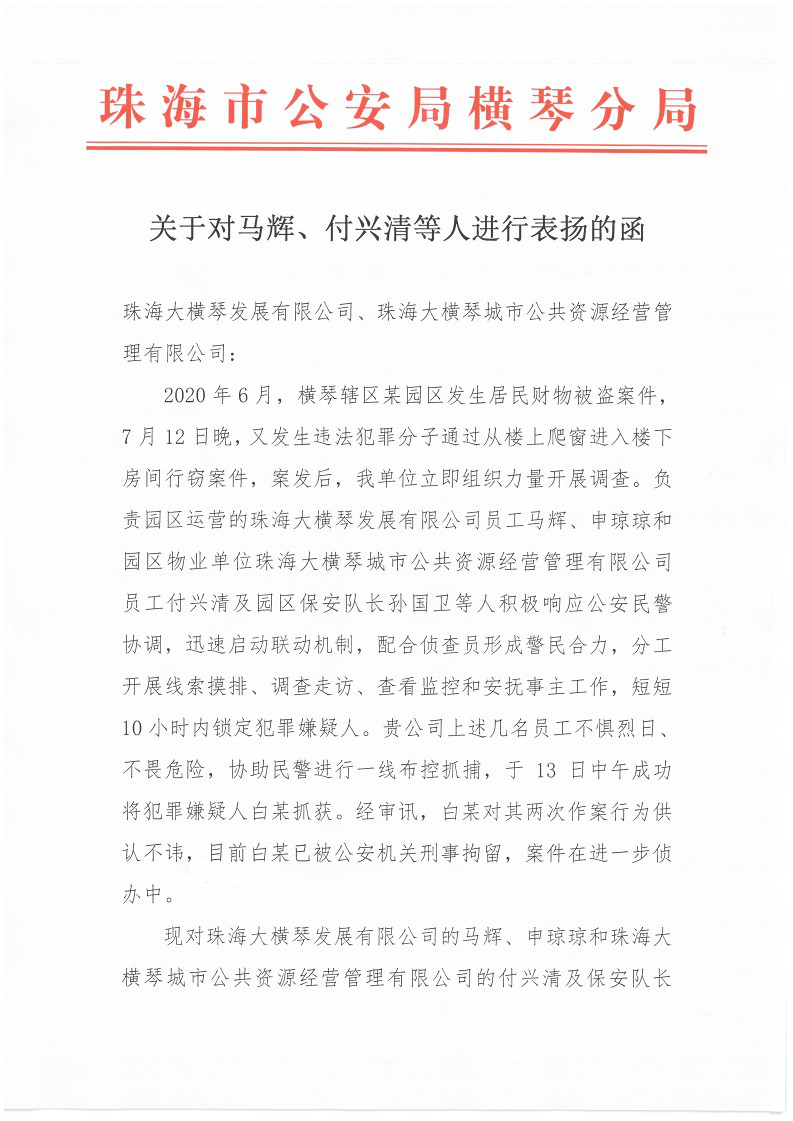 ▲珠海市公安局橫琴派出所對馬輝、申瓊瓊、付興清、孫國衛(wèi)等人勇敢無畏地協(xié)助公安機關(guān)偵破案件的行為提出表揚。