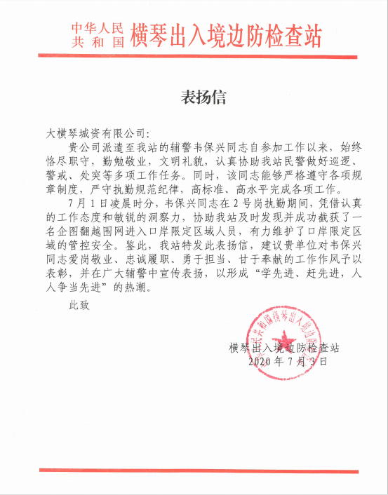 ▲橫琴出入境邊防檢查站發(fā)來表揚信,對韋保興愛崗敬業(yè)、勇于擔(dān)當(dāng)、甘于奉獻(xiàn)的工作作風(fēng)提出表揚。