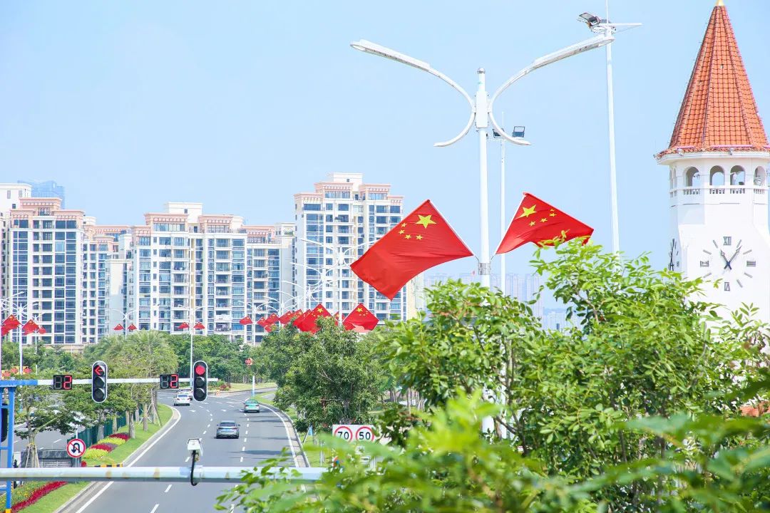 橫琴大橋、寶興路、環(huán)島東路、長隆大道(長隆段)……在橫琴的各個(gè)主干道路,一面面五星紅旗整齊劃一,一眼望去儼然是紅色的海洋,在綠樹藍(lán)天的映襯下,格外艷麗奪目。