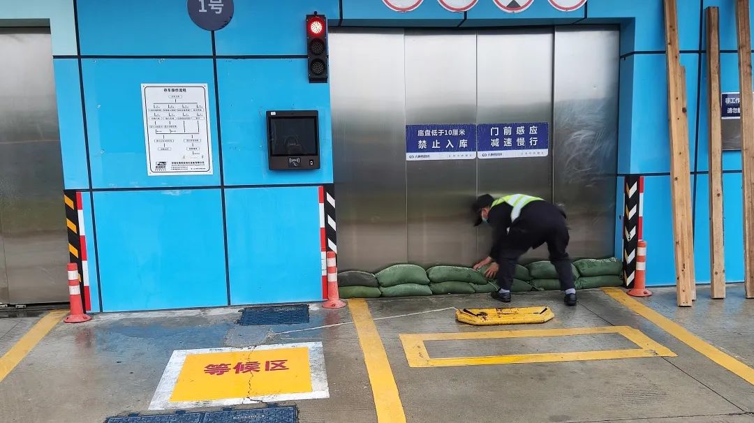 ▲模擬臺風來襲,工作人員用沙袋對車庫門進行圍堵。