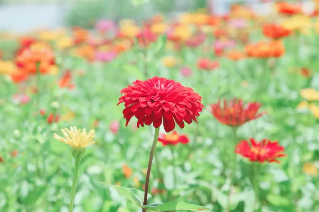燦爛的硫華菊和大花百日草花海正在盛放