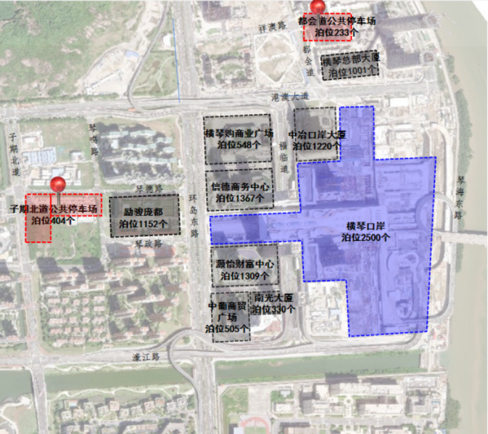子期北道公共停車場位于橫琴口岸對面,勵駿龐都廣場西側,距橫琴口岸步行距離1.7公里(約24分鐘),打車距離2.3公里(約6分鐘),居民、游客可就近停車進行購物、用餐、過關等活動。