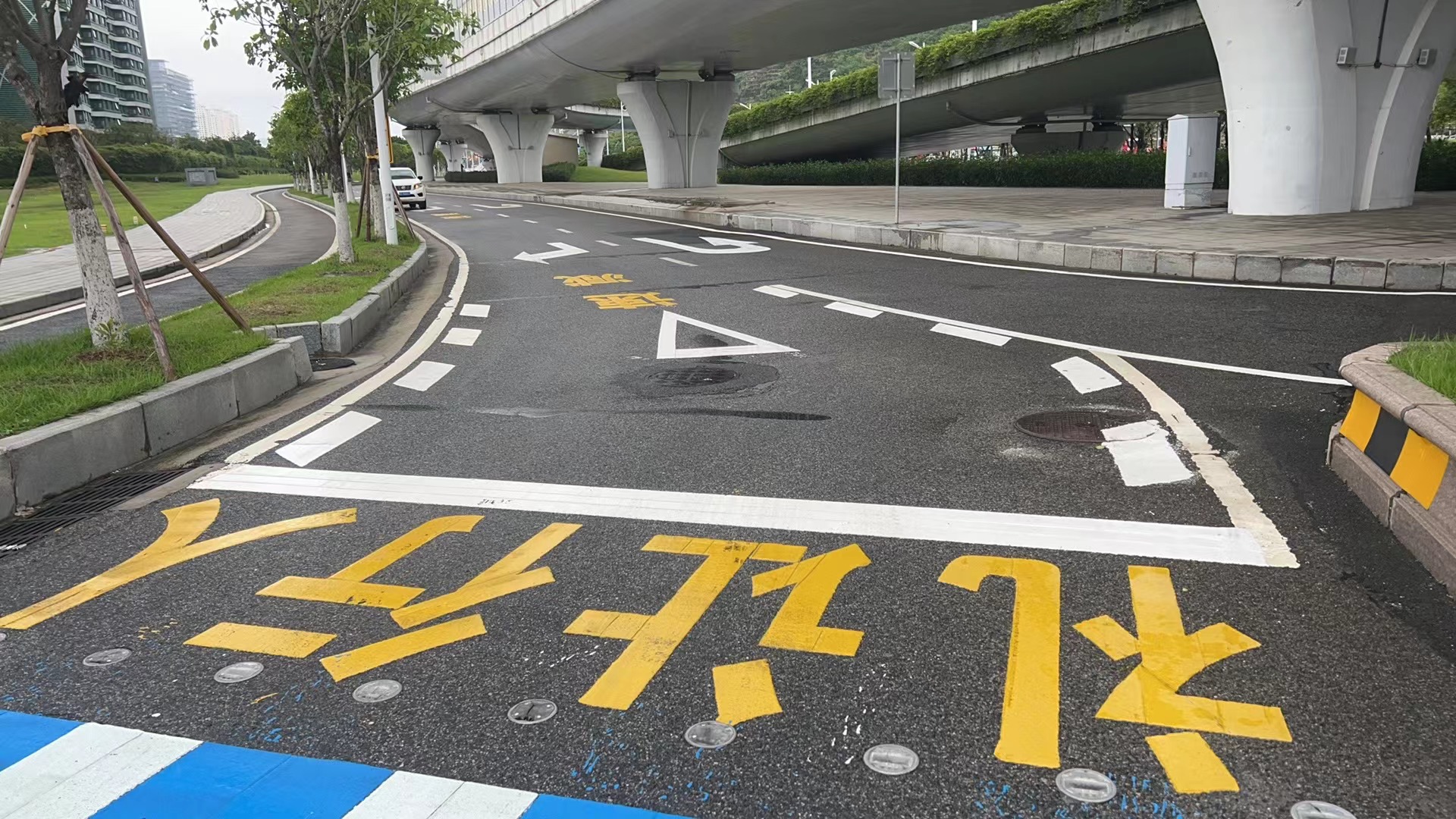 ▲在港澳大道右拐至環島東路處增加魚骨線、減速字符以及禮讓行人警示語
