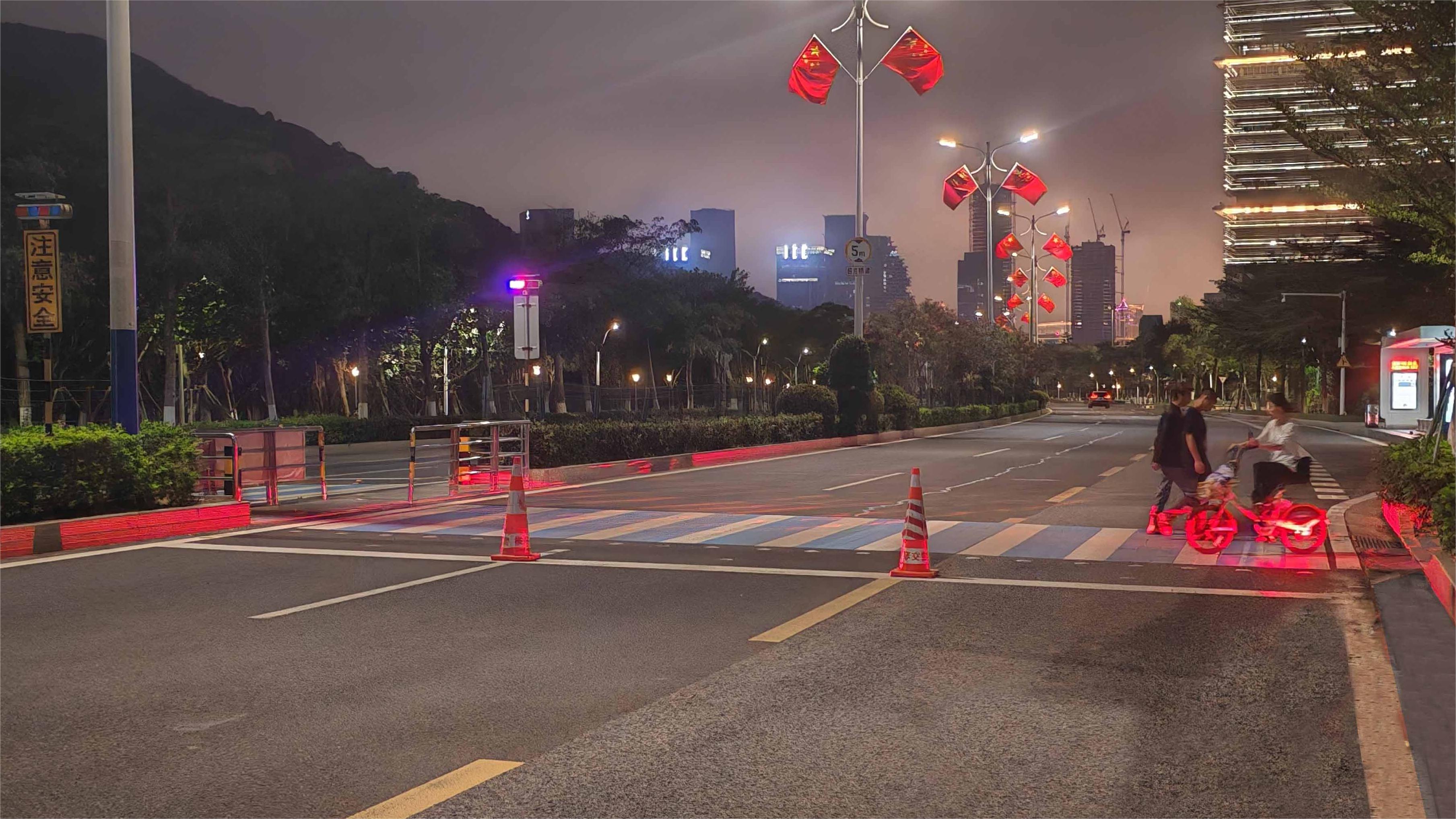 ▲在中央匯及下村村口處增設人行道激光警示設施(智慧斑馬線),夜間當行人通過斑馬線過街時,激光警示設施會自動投射紅色激光線,于行人小腿處形成紅色熒光橫條狀區域投影,有利于機動車駕駛人遠距離得到警示和發現行人動態,確保行人過街安全。