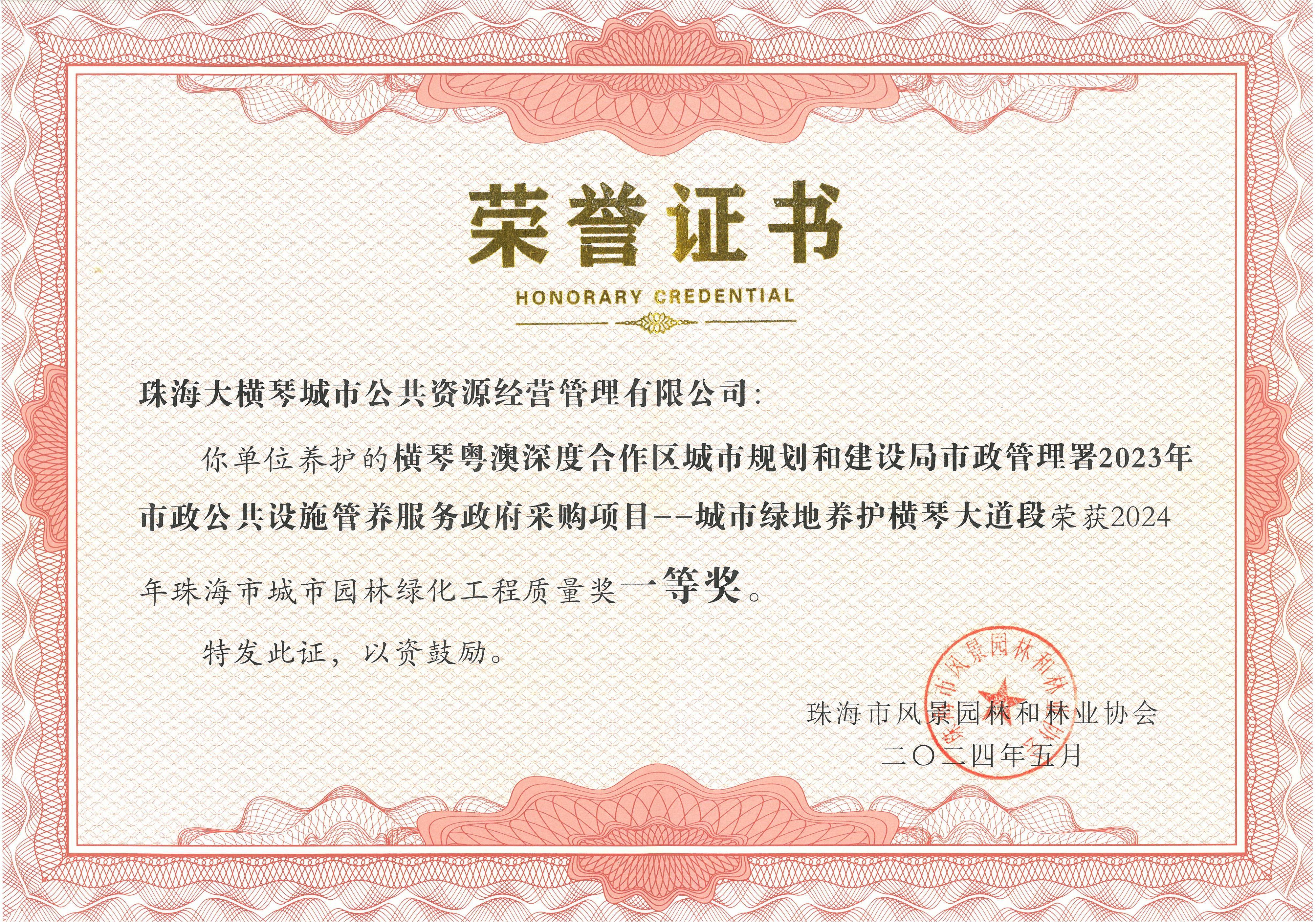 本次獲獎,既是對大橫琴城資綠化養護質量和水平的高度認可,也是推動大橫琴城資持續提升園林綠化管養水平的不懈動力。