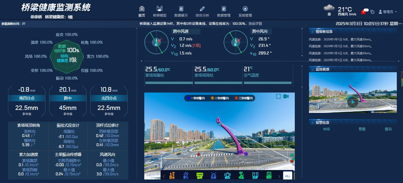 該系統如同橋梁全天候的“健康管家”,在主梁、主塔、拉索、支座及橋面等關鍵部位布設的智能監測設備則如同橋梁的 “觸角”,實時將監測數據傳送到系統中。無論是主塔的傾斜狀態,還是拉索的工作情況,亦或是橋面車輛的通行狀況等,系統都能精準捕捉,確保橋梁“健康狀況”盡在掌控之中。