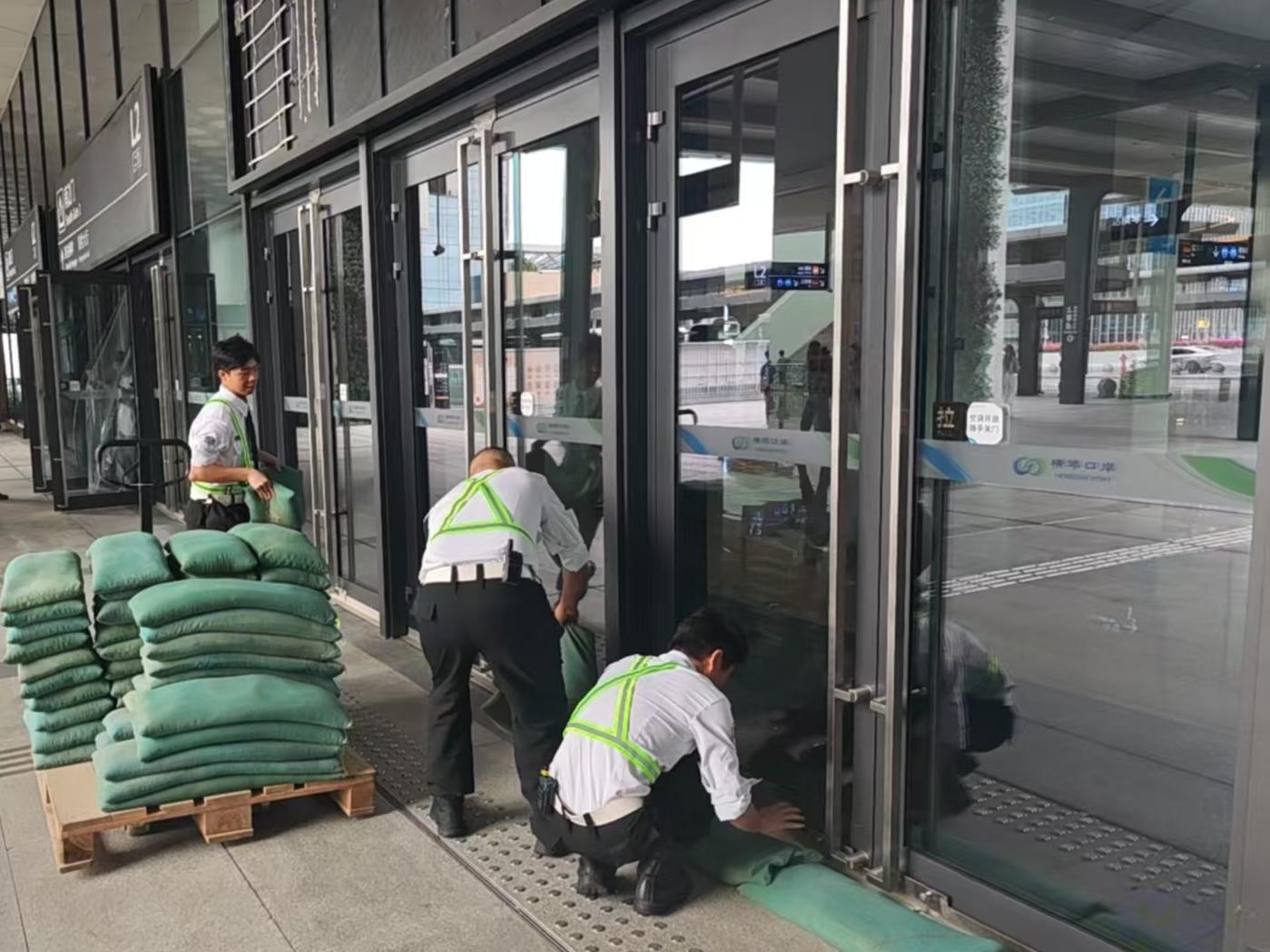 組織橫琴口岸通關區物業團隊對100余扇玻璃門進行加固,在易水浸區域放置沙袋、擋板。同時,全面清理雨水井、排水溝渠,確保排水暢通。